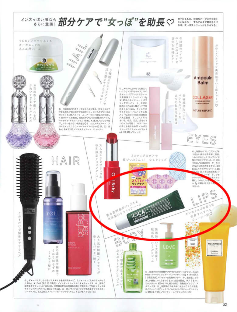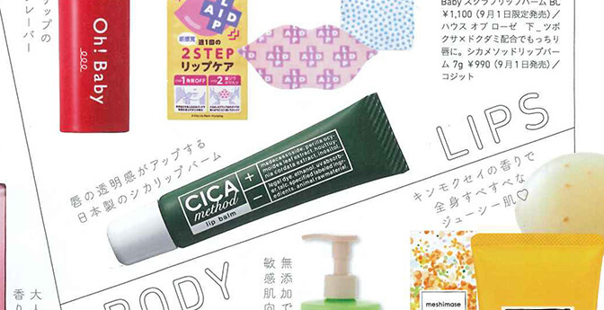 「JELLY 10月号」で「CICA method LIP BALM」が紹介されました 2022.09.02 / MEDIA 「JELLY 10月号」 「女っぽストリートのメイクは“ナチュラル”一択!」ページで 「CICA method LIP BALM」が紹介されました。 NEWS LIST PREV NEXT