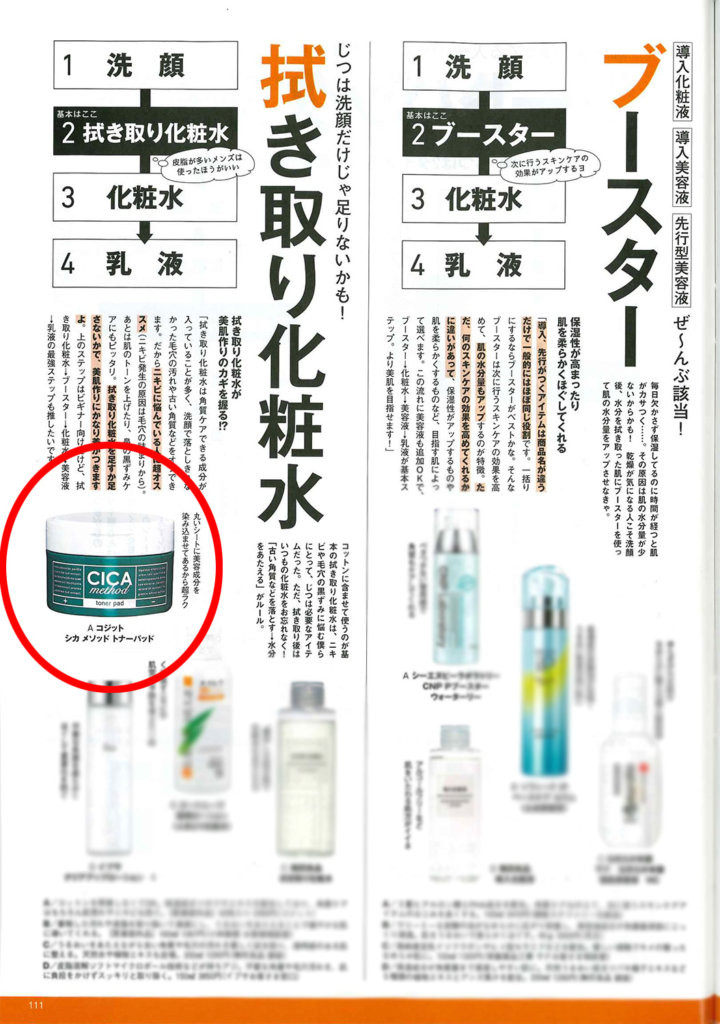 「FINEBOYS 3月号」で「CICA method TONER PAD」が紹介されました 2023.03.01 / MEDIA 「FINEBOYS 3月号」 「それ何番目?美容」のページで 「CICA method TONER PAD」が紹介されました。 NEWS LIST PREV NEXT