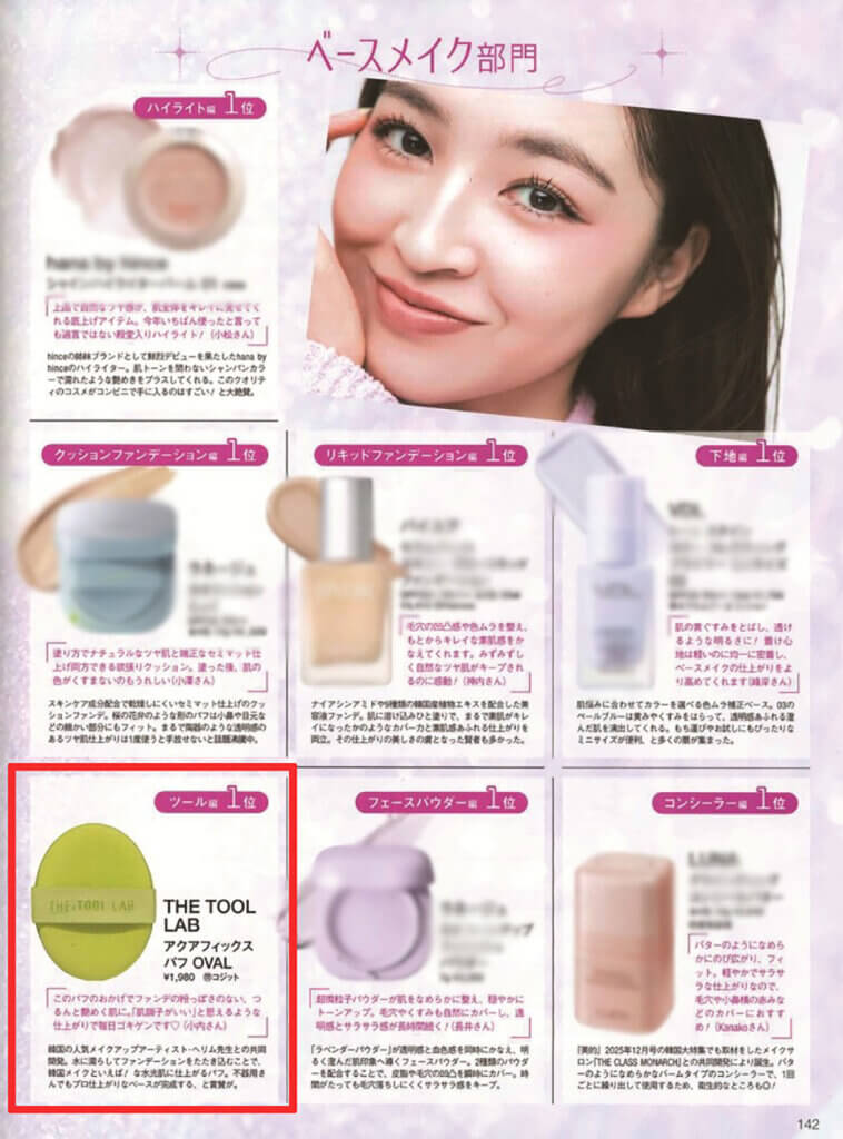 ■【美的2月号】 「韓国BeautyTalk 韓国通な賢者たちが選んだ2025年年間韓国ベストコスメ」のページで ・THE TOOL LAB超密着アクアフィックスパフ OVAL が紹介されました。